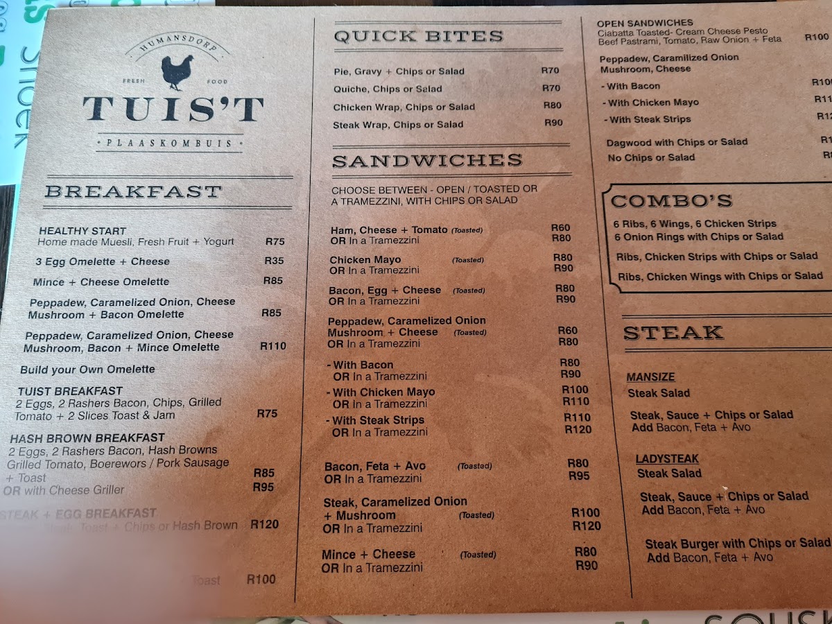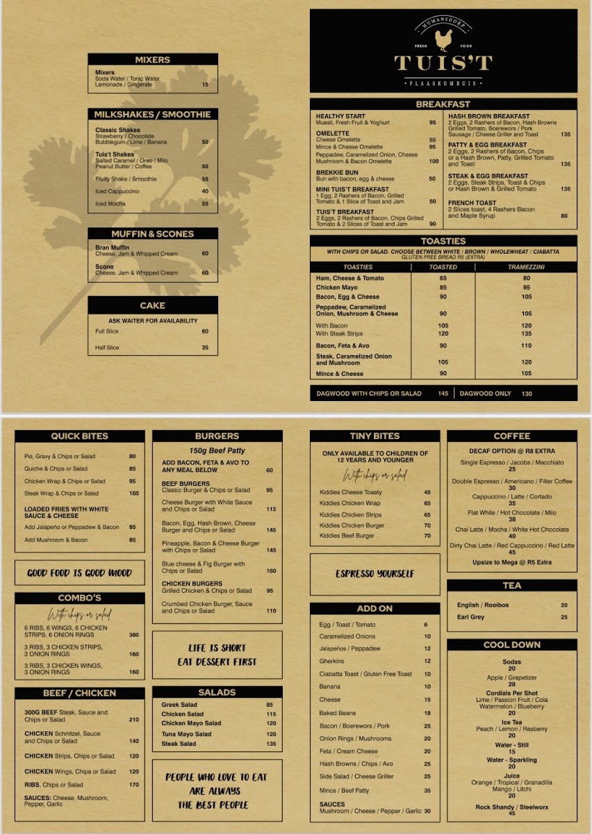 And of course, no visit would be complete without trying the Cheese Cake, a smooth and decadent dessert that promises to leave you wanting more. With such a diverse selection, the menu at Tuis't Plaaskombuis guarantees a satisfying experience for every taste and preference.
